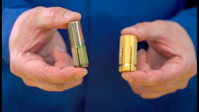 Латунный анкер забивного типа, на внешней поверхности которого имеются специальные насечки, – это полый цилиндр с внутренней резьбой. Такие анкеры часто сравнивают с цангой, потому что их рабочий наконечник выполнен в виде распорной зоны, составленной из четырех сегментов, которые сформированы продольными вырезами. Насечки на внешней поверхности латунного или стального изделия, непосредственно контактирующей с внутренними стенками отверстия, обеспечивают лучшее сцепление и, следовательно, более надежное крепление фиксируемого предмета.