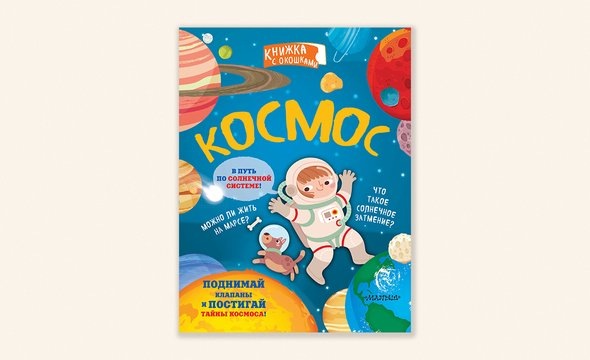 Эта книжка идеальна для первого знакомства юного любителя звезд и планет с космосом и небесными телами. Плотный картон, только самая важная информация, доступная самым маленьким, а главное — огромное количество окошек, которые нужно открывать! Готовьтесь к тому, что в компании этой мини-энциклопедии вы проведете ближайшие пару-тройку месяцев. Отлипнуть попросту невозможно, и детям не надоедает раз за разом находить то, что просит автор книги.