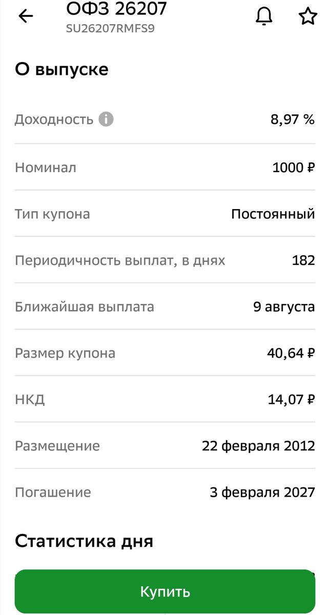 Например, при покупке ОФЗ-26207-ПД за 979,21 руб. вы получите ценную бумагу доходностью 8,97% на дату погашения, постоянную купонную выплату 2 раза в год в размере 40,64р и датой возврата номинала в 1000руб 3 февраля 2027года.