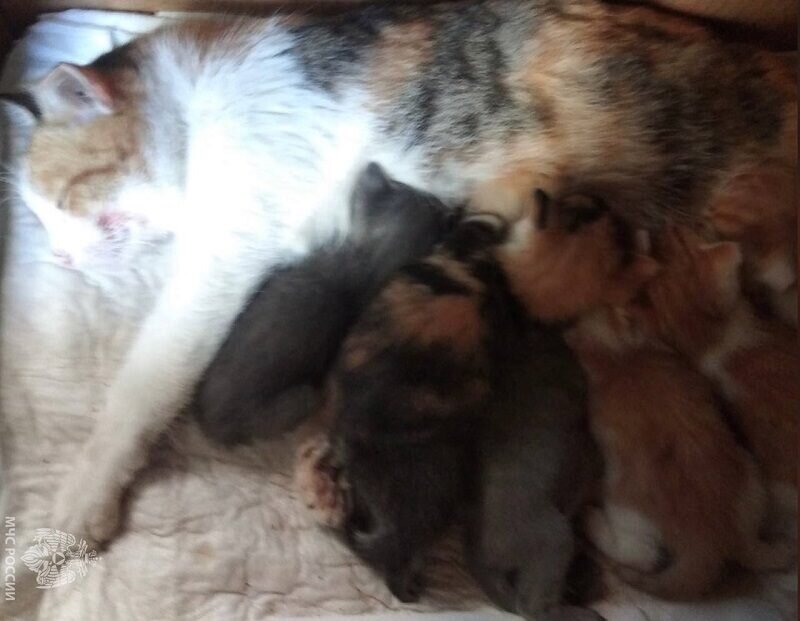 Пожарные обнаружили кошку с шестью котятами в одном из горящих помещений элеватора. Они вынесли животных на улицу и передали очевидцам.