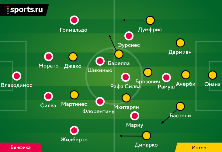 Обе команды выбрали классические для этого сезона сочетания: 4-2-3-1 (4-4-2) – у «Бенфики»; 3-5-2 – у «Интера».