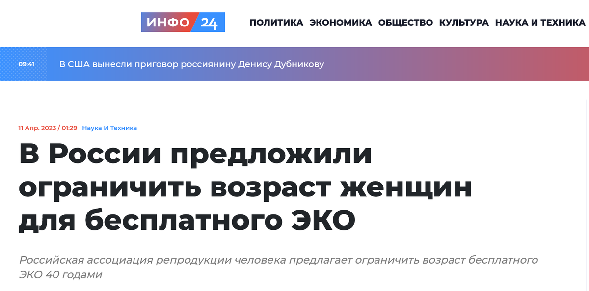 В России предложили ограничить возраст женщин для бесплатного ЭКО — пишут в СМИ. Якобы женщинам старше 38–40 лет из-за низкой вероятности рождения здорового ребёнка не будут предоставлять квоту на экстракорпоральное оплодотворение. В Минздраве сообщили, что не планируют вводить возрастных ограничений для женщин, желающих родить ребенка с помощью экстракорпорального оплодотворения. На круглом столе по проблемам рождаемости в Совете Федерации главный внештатный специалист по репродуктивному здоровью Минздрава Наталья Долгушина рассказала, что по рекомендации Всемирной организации здравоохранения (ВОЗ) предельным репродуктивным возрастом у женщин является 49 лет. Однако, по ее словам, такого понятия в российском законодательстве нет. Известия: В Минздраве опровергли планы ограничить возраст женщин для ЭКО