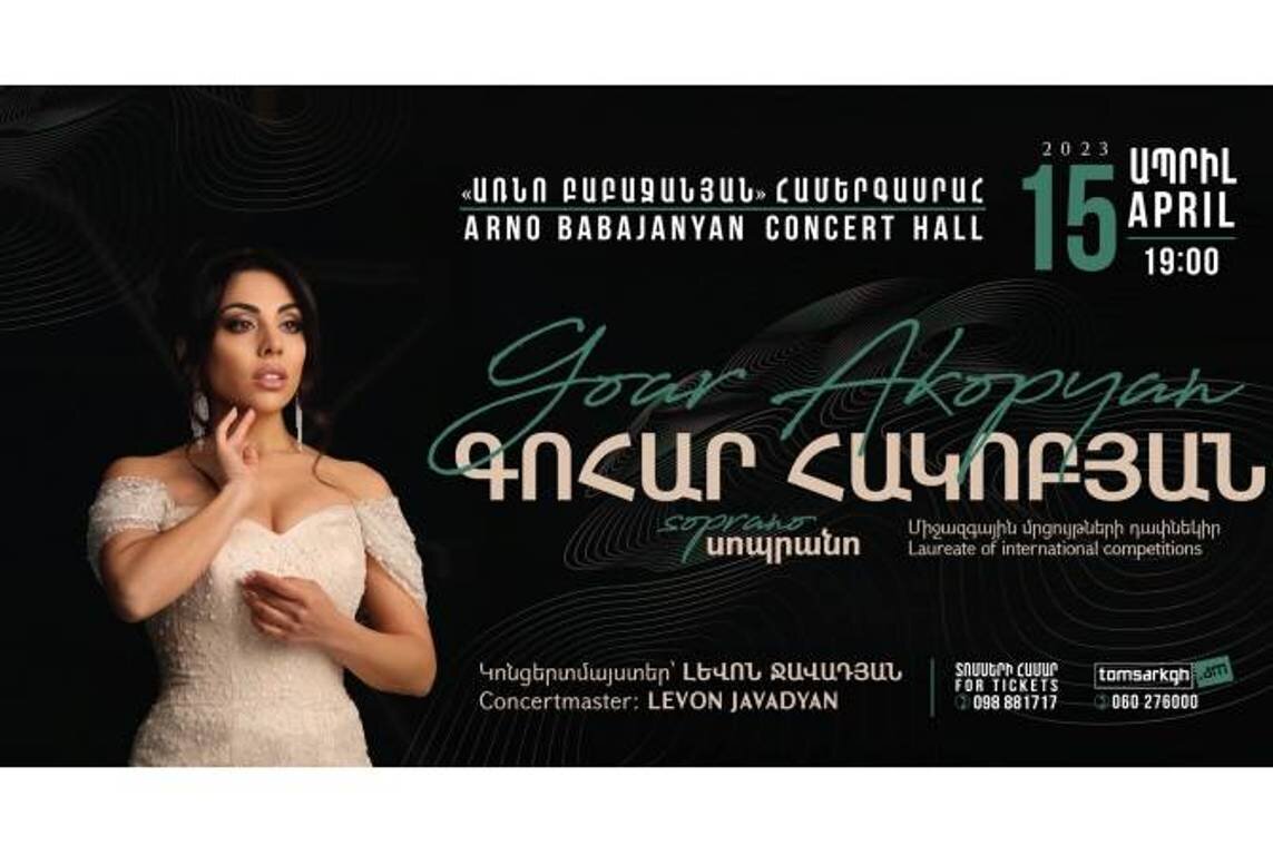 В концертном зале «Арно Бабаджанян» 15 апреля впервые в Армении выступит с сольным концертом сопрано, лауреат международных конкурсов Гоар Акопян. Прозвучат произведения Баха, Беллини, Пуччини, Россини, Доницетти, Гуно, Пуленка, Делиба, А.Бабаджаняна, Н.Зарифяна и других композиторов. Концертмейстер: руководитель Молодежной оперной программы Национального академического театра оперы и балета имени Ал.Спендиаряна, пианист Левон Джавадян.