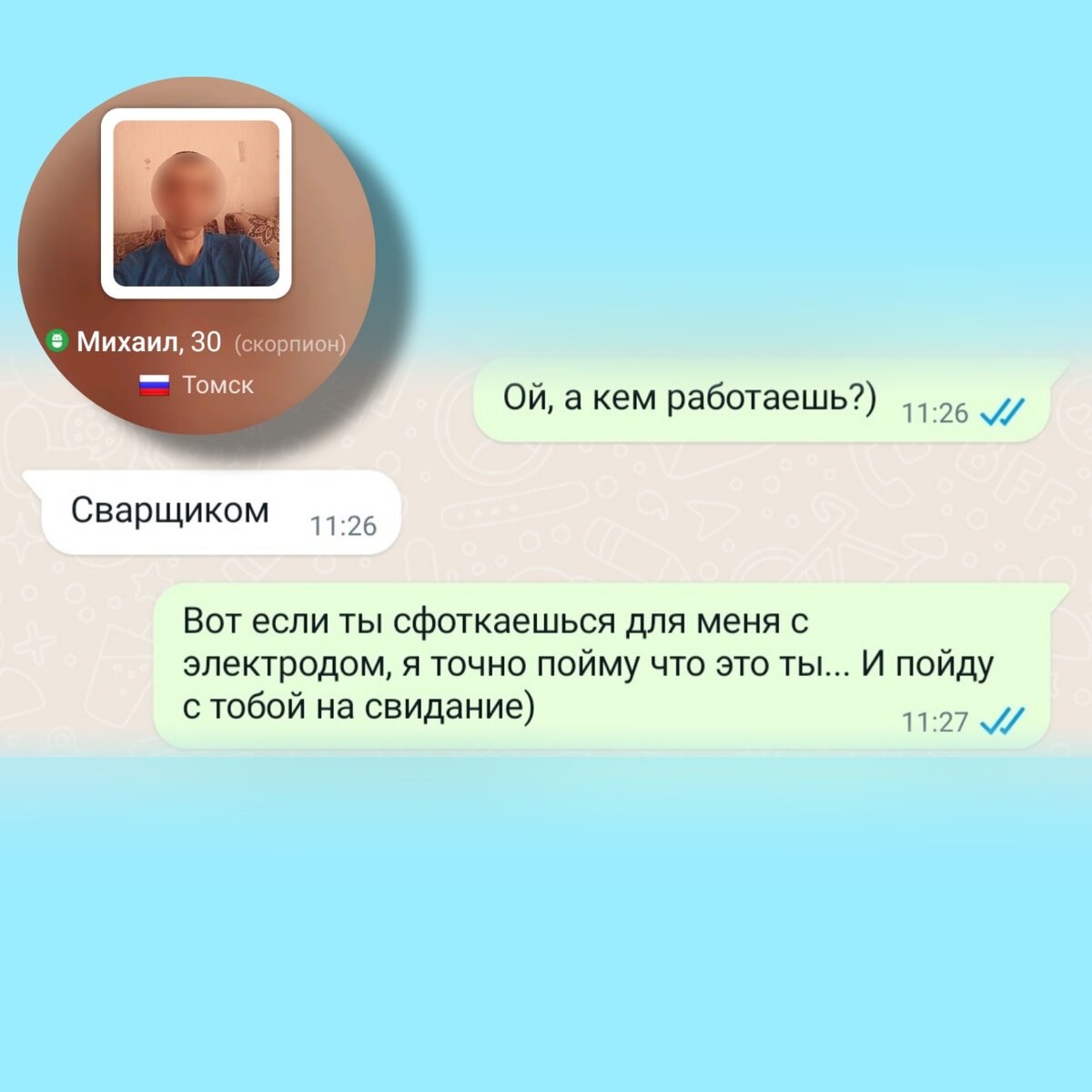 Написал мне значит сварщик Михаил, ну я конечно же не поверил что это он мне пишет и попросил скинуть фото с электродом в руках 😁 👺Как же он сопротивляется, ведь можно сфотаться в маске... 🤣Шутник какой, но электрод в руках я точно выпрошу... 🙃 Как думаете, спугнул его? Может пообщаться с ним голосовыми да соблазнить?))