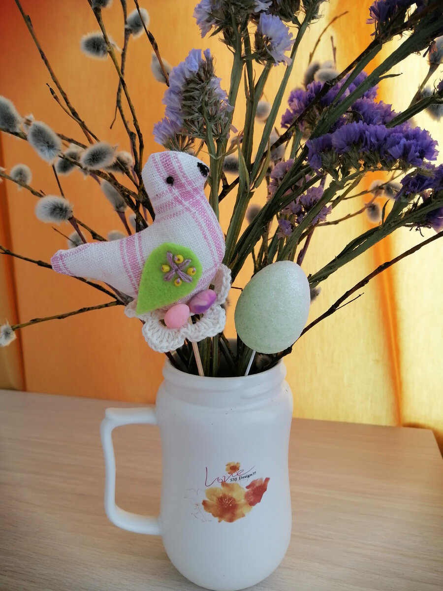 Всем привет! Такие птички из ткани украсят собой вербные букеты, пасхальные композиции и веночки. Выкройка птички высотой 7см. без припусков на швы. Прошиваем по контуру, оставляя снизу отверстие для выворачивания и набивки синтепоном. Затем низ стягиваем ниткой. Крылья делаем из фетра. Для украшения использовала вышивку и вязаные цветы. Птичку приклеиваем к цветку. Клюв и крапинки рисуем акриловыми красками. Для украшения я использовала ягодки и яйца из полимерной глины (пластики). Таких птичек можно ещё и на ниточку приладить - повесить на ветку или гирлянду. Я приделала к ним деревянную шпажку. Птички получились классные и уже все разлетелись по разным домам. Даже себе ничего не осталось. Буду шить новую партию птиц! Хорошей всем пасхальной недели! Всех благ!