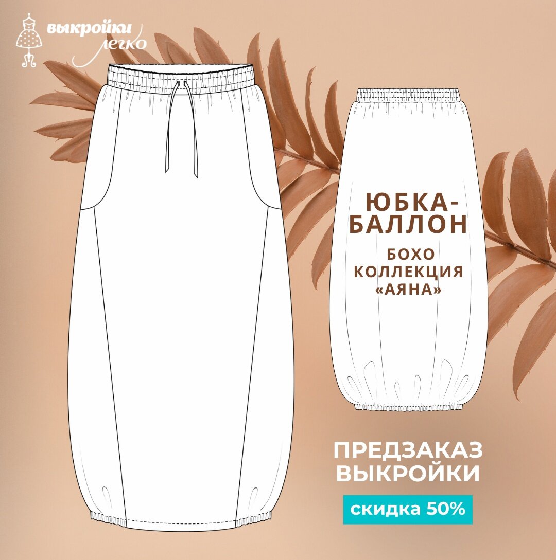 Это последняя модель из коллекции, посвященной бохо-стилю. Свободная юбка на поясе-резинке и необычно сформированным низом — с резинками по бокам, формирующими силуэт «баллон» или «кокон». Модель всесезонная. Сшейте юбку сейчас — на лето, из хлопка, льна, тонкой джинсовой ткани. А осенью раскроите её повторно из шерстяной, полушерстяной тканей, футера. Описание модели: Юбка женская силуэта «баллон», с поясом-резинкой, рельефными швами и карманами. На переднем полотнище юбки выполнены рельефные швы с карманами. Заднее полотнище без вытачек. Верхний срез юбки обработан притачным поясом с эластичной лентой (резинкой) и кулиской со шнурком. Нижний срез обработан закрытым швом вподгибку и частично обработан эластичной лентой, формирующей силуэт юбки. Длина изделия миди. Размеры выкроек - с 36 по 64, рост 152-170. Сейчас эта модель доступна по предзаказу с максимальной скидкой 50%. Лекала, фотографии, подробное описание выкройки и фото мастер-класс по пошиву появятся в день выхода выкройки.