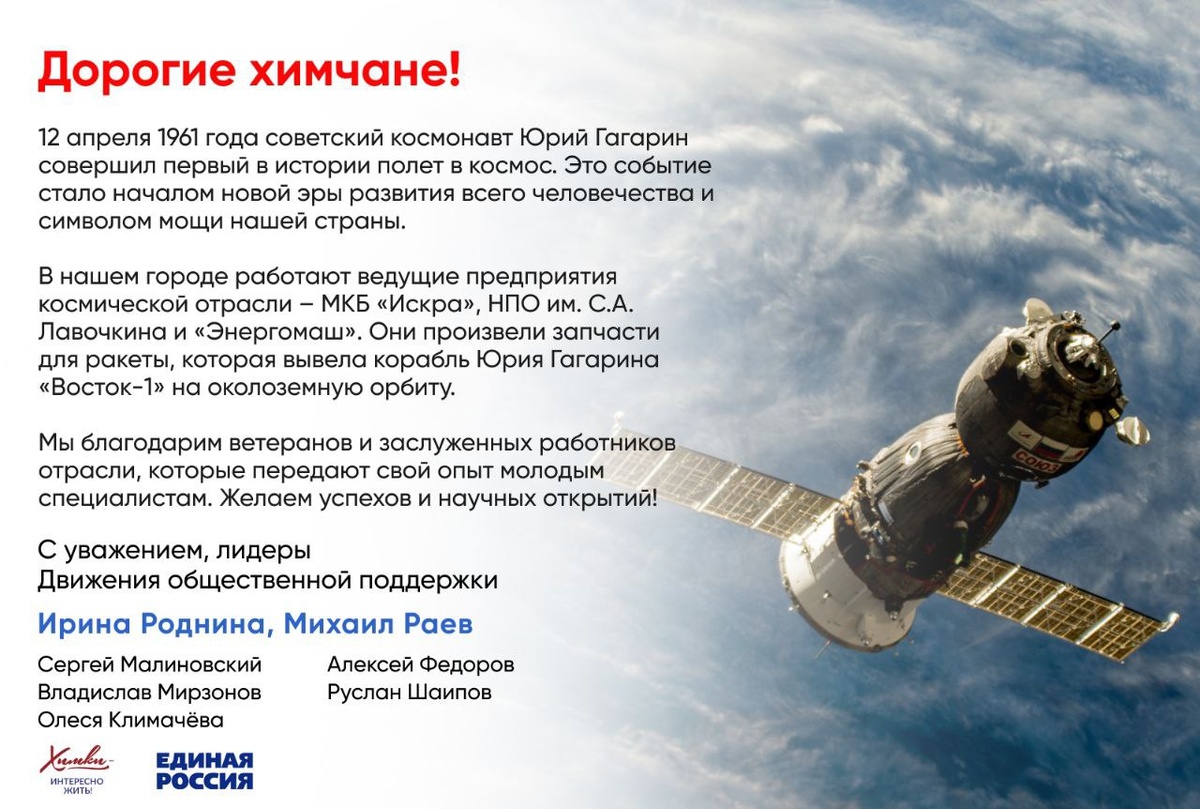 12 апреля 1961 года советский космонавт Юрий Гагарин совершил первый в истории пилотируемый полет в космос. Это событие стало началом новой эры развития всего человечества и символом мощи нашей страны. В Химках работают ведущие предприятия космической отрасли – МКБ «Искра», НПО им. С.А. Лавочкина и «Энергомаш». Они произвели запчасти для ракеты, которая вывела корабль Юрия Гагарина «Восток-1» на околоземную орбиту. Мы благодарим ветеранов и заслуженных работников отрасли, которые передают свой опыт молодым специалистам. Желаем успехов и научных открытий! С уважением, Депутат Совета депутатов городского округа Химки Алексей Федоров. #Поехали #ЕдинаяРоссия #ХимкиЕР #Брехово #ХимкиДОП #ЕдинаяРоссия #Федоров #СходняФирсановка #ЕР