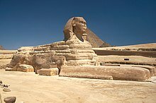 Великий сфинкс в Гизе, на фоне Великой пирамиды