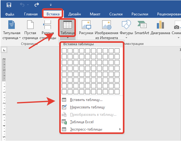 Переходим на вкладку «Вставка», нажимаем кнопку «Таблица». Откроется меню работы с созданием таблицы: