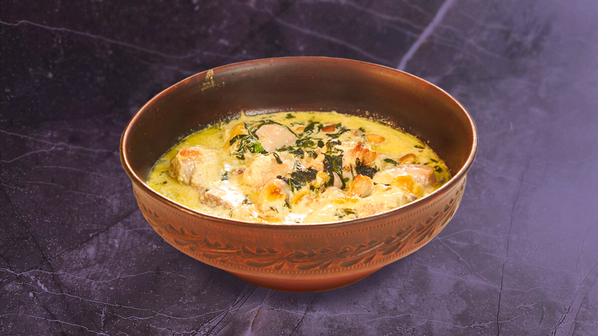 Ингредиенты: Куриные голени – 5 шт. Растительное масло – 50 мл. Сливочное масло – 50 гр. Копченый чечил – 100 гр. Шпинат свежий – 200 гр. Чеснок – 5 зуб. Сливки 33% – 300 мл. Вода – 100 мл. Соль/перец – по вкусу Рецепт: Разминаем чеснок ножом и нарезаем его. Обжариваем куриные ножки на растительном масле до золотистой корочки. Параллельно готовим соус. Кладем в сотейник сливочное масло. Как только оно растопилось, добавляем чеснок. Немного обжариваем и кладем шпинат, соль, перец. Перемешиваем. Вливаем сливки и еще раз солим. Нужно немного пересолить, так как мясо заберет часть вкусовых свойств. Доводим до кипения и выключаем огонь. Добавляем воду. Перемешиваем. Перекладываем курицу в глубокую посуду для запекания и заливаем соусом. Добавляем копченый чечил. Ставим в духовку, разогретую до 180 градусов на 1 час. Ароматные и нежные куриные ножки в чесночно-сливочном соусе готовы! Приятного аппетита! 🤤🍽️