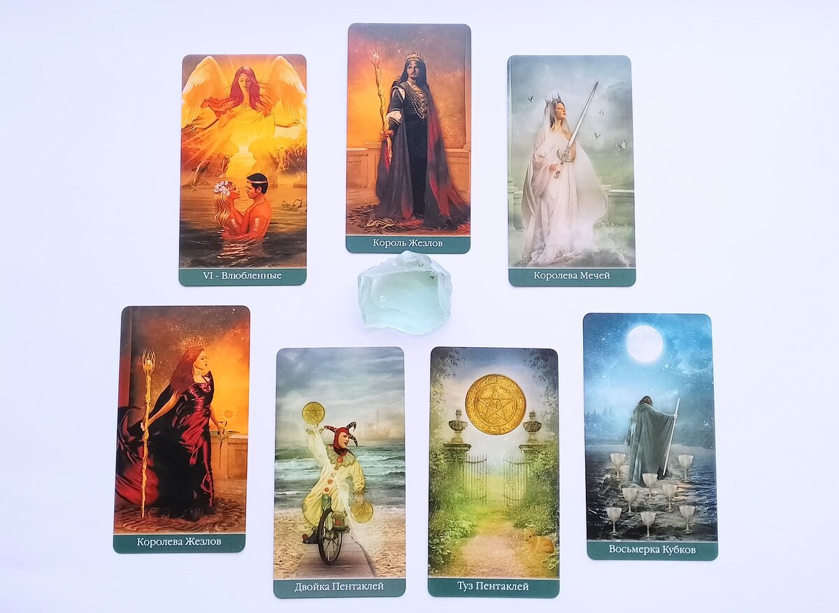 Начну с общего анализа: самым красивым и привлекающим, конечно, лежит старший аркан Влюблённые, это о многом говорит, о том, что пару связывают настоящие чувства, данные свыше, безусловная любовь, когда достаточно просто быть рядом и ощущать радость, страсть, притяжение...