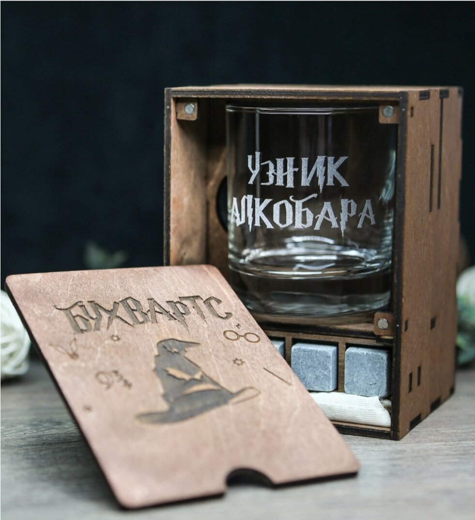 Набор для виски "Узник алкобара" - стильный и оригинальный подарок для мужчины, любящего крепкий алкоголь и фаната фильмов о Гарри Поттере. Комплект включает один стакан для виски с надписью "Узник Алкобара", четыре камня для ледяного виски и деревянную коробку в коричневом цвете. Стакан изготовлен из прочного и прозрачного стекла, имеет объём 320 мл. Лёгкость и удобство использования стакана позволяют наслаждаться вкусом любимого напитка без каких-либо препятствий. Камни для ледяного виски являются оригинальным решением, обеспечивающим концентрацию вкуса виски и сохранение его температуры. Обратите внимание, что камни не охлаждают, а поддерживают идеальную температуру для виски. Перед использованием, не забудьте положить их в морозилку. Стакан с надписью "Узник Алькобара" изображает знаменитый герб Хогвартса, и каждый, кто любит эту знаменитую серию книг и фильмов, наверняка будет рад такому подарку. Коробка надежно закрывается, не боится воды и не пропускает запахи. Камни для вис