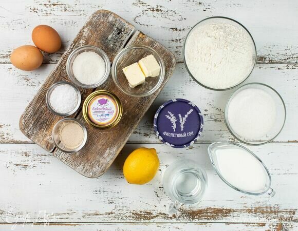 лаванда сушеная «Фиолетовый сон» - 1ч. л. Шаг: 1 Для приготовления выпечки нам понадобятся следующие ингредиенты. Шаг: 2 Подогрейте молоко в сотейнике, положите в него сливочное масло. Шаг: 3 Добавьте лавандовый мед «Фиолетовый сон», перемешайте и остудите. Добавьте к смеси 1 яйцо и еще раз перемешайте. Шаг: 4 Соедините в глубокой емкости просеянную муку, соль, сахар и дрожжи. Влейте жидкую смесь.