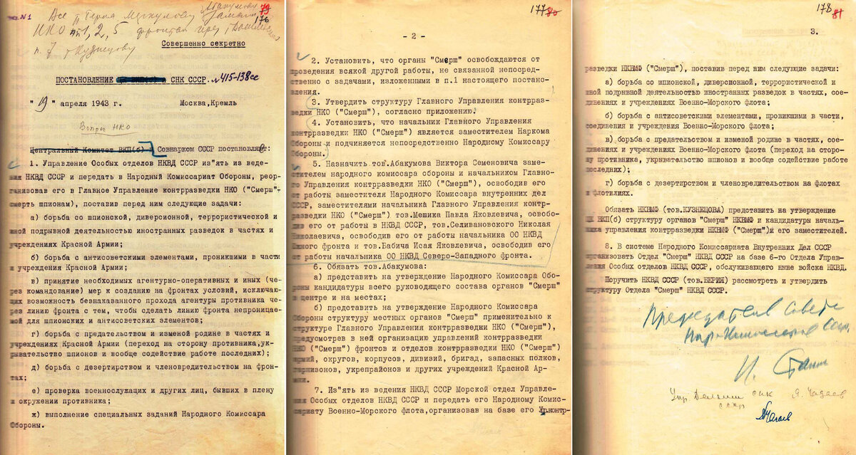 Данное название предложил лично Иосиф Сталин. ФСБ опубликовала секретные документы 1944 года к 80-летию создания ГУКР «Смерш». В них раскрываются основные цели и задачи советской контрразведки. «Смерш» был создан 19 апреля 1943 года. Название было предложено лично Генеральный секретарь ЦК КПСС Иосиф Сталин, а руководителем был назначен Виктор Абакумов из управления особых отделов НКВД СССР. Главной задачей контрразведки была борьба со шпионами, иностранной разведкой, антисоветскими элементами в Красной Армии, дезертирами, а также проверка военных, бывших в плену и окружении. Также ФСБ опубликовала выдержки из записей организации, которые касаются зверств латышских эсэсовцев над советскими пленными. Согласно рассекреченным документам, предатели родины 6 августа 1944 года захватили остатки 65-й Гвардейский стрелковый полк 22-й Гвардейской стрелковой дивизии и устроили кровавую расправу. Рядовому Караулову, младшему сержанту Корсакову и гвардии лейтенанту Богданову нацисты и латышские
