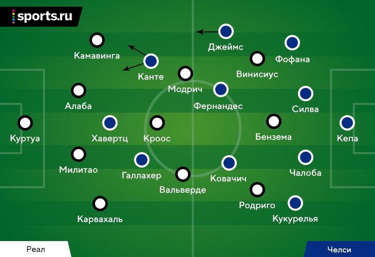 Анчелотти прочитал эту проблему и среагировал: «Нам было трудно справляться с позицией Канте в право-центральной зоне. Камавинга в первую очередь оказывал давление на Джеймса, а контролировать позицию Канте было трудно. Во втором тайме я изменил роль Вальверде – передвинул его в левую часть поля, чтобы контролировать проблемную зону. Мы прибавили. В первом тайме Модрич держался слишком близко к Энцо, а эта зона была неприкрытой. Камавинга получал эпизоды 2-в-1. Мы допустили шесть опасных подач в штрафную в первом тайме. Во втором прибавили при обороне таких эпизодов».