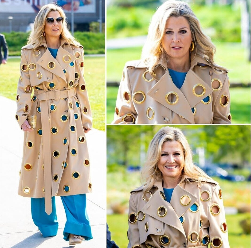 Королева Нидерландов Максима находилась с однодневным рабочим визитом в Милане 18 апреля 2023 года. Королева прибыла утром в район Изола, где посетила парк, спроектированный голландским ландшафтным архитектором Петрой Блез. Прибытие королевы Максимы в тренче с дырками не осталось незамеченным, что неудивительно. Длинное пальто с перфорацией, как у швейцарского сыра – творение известного голландского модельера Класа Иверсена. Пользователи соцсетей уже назвали этот наряд Максимы самым аппетитным. 😋 Под длинным пальто можно было заметить синий брючный комплект. С Максимой также была ее — теперь уже всем известная — вышитая сумочка от Begum Khan, образ дополнили нюдовые туфли-лодочки с бантиком от Ferragamo и солнцезащитные очки Cartier. Во второй половине дня королева Максима посетила Salone Satellite, целью которого является укрепление взаимосвязи между исследованиями, дизайном и промышленностью и которая ориентирована на дизайнеров в возрасте до 35 лет. Королева также поговорила со с