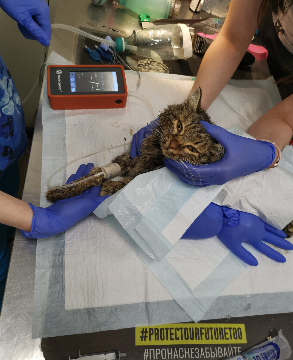 Позвонили в клинику, взяли с собой шприцы, Диана укутала кота в плед и мы помчались в клинику, предварительно предупредив, что везём тяжелого пациента. В клинике уже были готовы к реанимации, но Черчилль недавно вернувшийся с того света, пока туда не собирался. Температура не мерилась, настолько низкая. Давление нормальное и сахар тоже. Диана вколола при реанимации глюкозу.