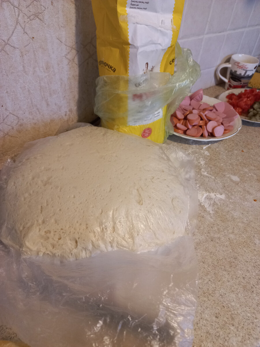 Я делаю пиццу на обычном дрожжевом тесте.Моя семья очень любит. Ингридиенты: Мука Подсолнечное масло Дрожжи Соль,сахар по вкусу Для начинки я беру сосиски,два вида колбасы,вареную и копченую или ветчину,огурцы соленые,помидоры свежие,кетчуп ,майонез,сыр.Я Ну сколько по граммовке брать ингридиенты для теста ,это может каждый сам решить,кому то меньше надо,чтоб получилось,кому то больше. Я наливаю в большую емкость кипяток,жду ,когда немного остынет,но еще горячевато,затем добавляю туда сахар,соль,немного подсолнечного масла и дрожжи,оставляю минут на 5-10 ,потом добавляю муку и вымешиваю.Формирую колобок ,накрыть можно целофановым пакетом или пищевой пленкой И оставляю тесто подходить. Вот такое тесто в результате получается. Такое же тесто я делаю на пирожки,беляши. Потом отделяю ножом часть теста вымешиваю,формирую колбаску ,режу ее на части ,раскатываю ,складываю на противень,смазанный подсолнечным маслом и делаю начинку. Сначала смазываю кетчупом и майонезом,потом выкладываю всю н