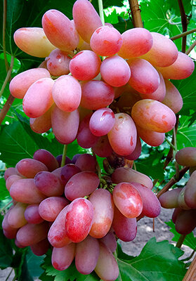 Раннего срока созревания – первая декада августа. Куст сильнорослый. Цветок обоеполый. Гроздь цилиндроконическая, средней плотности, крупная, массой 500-900 г. Ягода яйцевидная, крупная, массой 8-11 г, розовая. Вкус мускатный, мякоть мясисто-сочная. Кожица съедаемая.