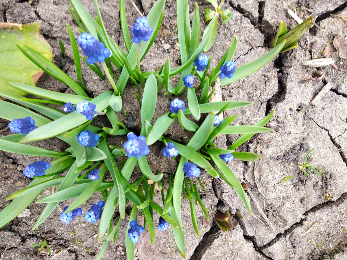 Впервые у нас такое, чтобы земля покрылась панцирем, земля сверху дубОвая, а под коркой сырая. Хотела чеснок прорыхлить,но чеснок выскакивает вместе с коркой. Наверное дожди осенние и зимние сыграли свою роль. Земля после зимы должна парковать, раньше помню идёшь, а от земли пар поднимается, а сейчас как в пустыне. Растения в саду с трудом пробиваются сквозь корку. Мускарики мои еле пробились, тоже пробовала рыхлить, получаются камни, одна надежда на дождик. Шалфей мучнистый Блю, живой, кто то мне говорил, что он однолетник. А это нарциссы, но мои почему то поздно цветут обычными белыми цветами. Ландышам все ни по чем, прут со всех щелей. А это купена показала свои носики, очень нравится когда растения всходят. Пионы бордовые тоже всходят, розовый ещё не очень. Фиалочка продолжает цвести. Барбарис Мария распускает свои листики. Жимолость Каприфоль тоже покрывается зелёным нарядом. Девочки, а это не знаю что, сеяла в прошлом году, был один жёлтый цветочек, похожий на ромашку, в этом го