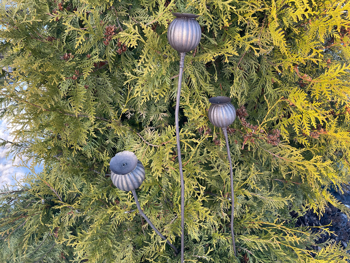 Сделала я очередную "красоту" для сада. В кавычки слово "красота" взяла не потому, что сомневаюсь, а потому, что заезжено оно в публикациях. Любую поделку-переделку старого свитера или баночки от сметаны так называют. Видео: Декор для сада своими руками. Маки из елочных шаров. Походила, повтыкала в разные места участка. Сделала несколько фото. Вроде даже красивые фотографии получились. Вчера пришёл в гости сосед. Сидим, разговариваем. Он встаёт, берёт фотоаппарат и выходит на улицу. Вот его видение: Заметна разница? Оказывается, "закатное солнце смягчает свет, подходит к жанру этой фотографии, передаёт правильное настроение" и пр. и пр. Так у меня тоже закатное солнце! И жанр такой же - сад, хвойные. И настроение отличное! Похожая ситуация у меня и с цветниками. Вроде, и теорию знаю про сочетания цветов (колеров) и цветов (растений), и сажаю много всего и разного, а вот нет гармонии. Не вижу, не чувствую жанра или неправильно передаю настроение. Да, есть над чем и над кем работать.