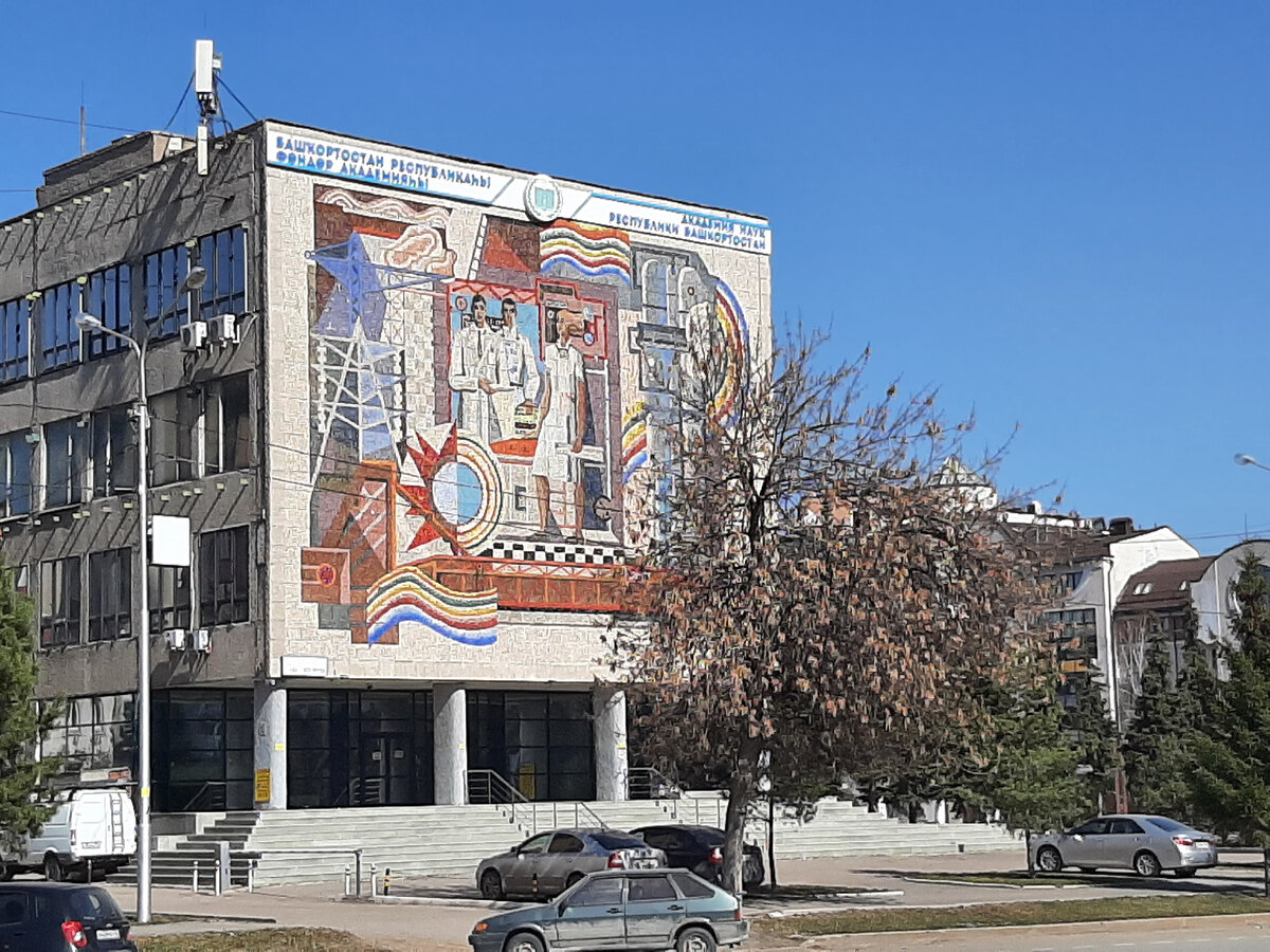 Воскресенье, погуляв по центру города, посетив монументальный памятник М.Кариму и мини памятник клещу Валере, собралась на автобусную остановку, домой. И тут притормозила. Ну как могла пройти мимо то? Да, я его видела с юности. На углу ул. Ленина и Кирова (если точно, то адрес г. Уфа, ул. Кирова д. 15) Два года, от остановки напротив здания уходил наш служебный автобус - каждое утро меня встречало это. Но вот именно сейчас торкнуло. Обычное типовое четырехэтажное здание 70х годов прошлого века. Клево звучит. Само по себе ни о чем. В здании располагается Академии наук Республики Башкортостан. Но вот она вишенка то! На стене здания самое известное из мозаичных панно в городе. Создано в 1973 году, авторами являются Александр Пантелеев и Александр Юдин. Яркое, заметное. Сами полюбуйтесь. В создании панно использованы: мрамор и яшма – с Урала, смальта (кубики или пластинки из цветного непрозрачного стекла для мозаичных работ) для мозаики ее привезли из Москвы и Киева. Мозаичное панно на сте