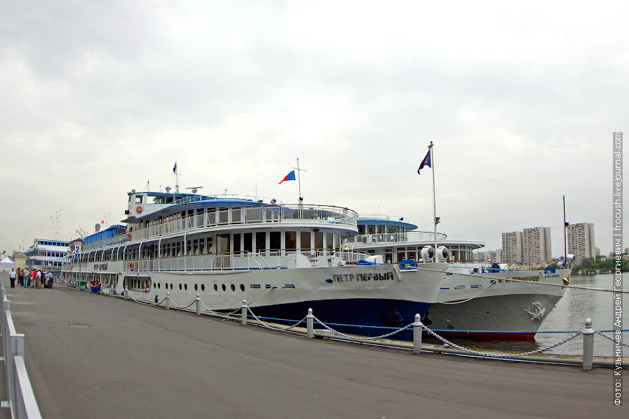 24 июня 2011 года. Теплоходы «Петр Первый» и «Ф.И. Панферов» у причала Северного речного вокзала Москвы.
