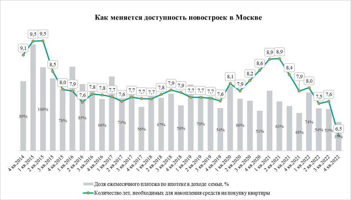 По итогам четвертого квартала 2022 года коэффициент доступности новостроек Москвы составил шесть лет и пять месяцев. Именно за этот срок семья москвичей со средним доходом может накопить на двухкомнатную квартиру в новостройке массового сегмента. Обновленная оценка на 16 месяцев меньше, чем в четвертом квартале 2021 года, когда доступность новостроек была зафиксирована на отметке семь лет и девять месяцев, говорится в поступившем в редакцию исследовании аналитиков компании «Метриум». Как считали За основу при расчетах была взята семья из двух работающих человек со среднедушевым денежным доходом москвича (122,94 тыс. руб., по данным Росстата). Из их совокупного дохода вычитается прожиточный минимум (21,7 тыс. руб.) двух взрослых трудоспособных жителей Москвы, устанавливаемый властями столицы. Средняя стоимость квартиры в массовом сегменте новостроек Москвы составляет 12,05 млн руб. В течение прошлого года коэффициент доступности колебался. В первом квартале он составил восемь лет, во вт
