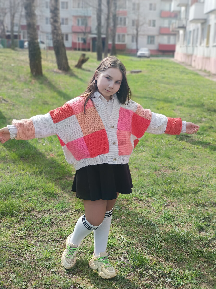 Краткое описание вязания кардигана. Пряжа Ализе Ланаголд Классик 240м/100г, Газзал беби вул XL 100м/50г. Крючок 4 для резинки, 4,5 для квадратов. Один квадрат - 15×15см. Набирала 22 вп и вязала 24ряда. Связала 27 квадратов. Спинка - 15 шт (3×5), полочки по 6 шт (3×2). Сшила иглой. Для рукавов связала 2 прямоугольника. Набрала 60 вп, связала 54 ряда. Сшила. Резинка - набрала 10 вп, вязала ст без нак за заднюю полупетлю. Длину полосы мерила по полотну. Таких нужно 2, по низу кардигана и на планку. Пришила иглой. Манжет - набрала 10 вп, вязала ст без нак за заднюю полупетлю. Длину мерила по обхвату запястья. Сшила соед ст, пришила к рукаву. Кардиган готов🎉 Если остались вопросы, задавайте в комментариях🤍
