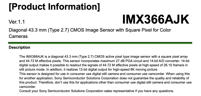 Корпорация Sony официально представила два новых полнокадровых сенсора и сделала их доступными для покупки сторонним компаниям. Речь идёт о матрицах Sony IMX366AJK и Sony IMX455AQK. Сенсор Sony IMX366AJK – это сенсор с обратной засветкой, с разрешением 44.72 миллиона пикселей и скоростью съёмки до 26.15 кадров в секунду. Он имеет возможность записи 8K 12-бит и предназначен для использования в потребительских цифровых фотоаппаратах и видеокамерах, с электронным затвором с передней шторкой. Вторая матрица — Sony IMX455AQK также имеет полнокадровый формат и тоже является сенсором с обратной засветкой, с более высоким разрешением — 61.17 миллиона пикселей. Он может снимать в 16-битном режиме со скоростью 3.9 кадра в секунду, 14-битном режиме со скоростью 9.98 кадра в секунду и 12-битном режиме со скоростью 17.91 кадра в секунду. Данная матрица имеет возможность записи 8K 30к/с / 4K 60к/с и предназначена для использования в потребительских цифровых фотоаппаратах и видеокамерах, с электронны