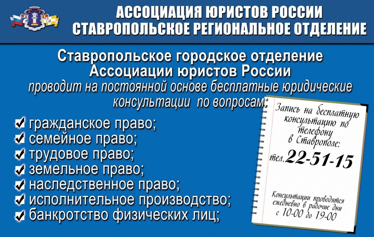 Уважаемые подписчики нашего канала! Агентство Правовых Инициатив совместно со Ставропольским городским отделением Ассоциации Юристов России приглашает на бесплатные консультации по юридическим вопросам. Консультации проводят профессиональные юристы. Темы консультаций: семейное право, трудовое право, земельное право, гаражная амнистия, дачная амнистия, банкротство физических лиц, исполнительное производство. Всегда рады видеть Вас. Консультации проводятся по адресу: город Ставрополь, улица Гражданская, 11 А, 3 этаж с 10-00 до 19-00 Запись по телефонам +7 8652 22-51-15; +7 962 422 51-15, записаться можно на сайте СГО АЮР -https://sgoalr-26.ru/ наш канал в Телеграмм: https://t.me/ingard26