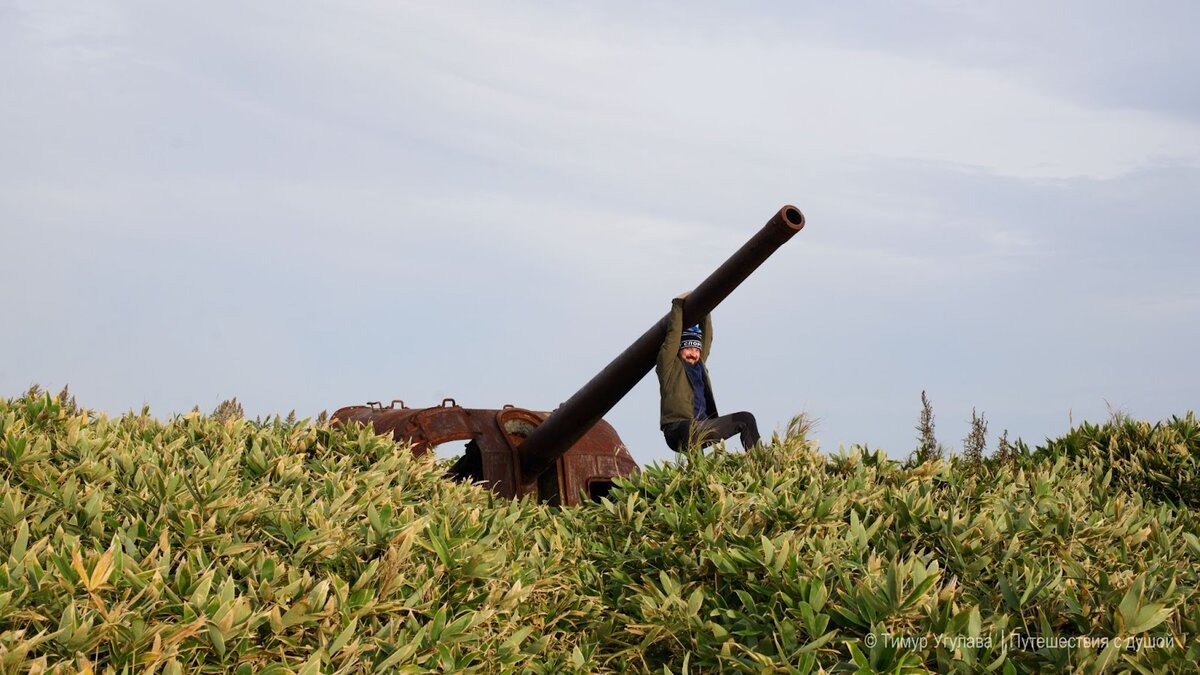 В этом плане Сахалин сильно напоминает Крым: на территории острова разбросано великое множество заброшенных военных объектов. Сталкерам точно есть чем себя занять на Сахалине. Одно из таких мест — японские катакомбы на мысе Крильон, самой южной точки Сахалина. Это большой укрепрайон, который сохранился со времён периода японского правления Карафуто. Туда-то и направился наш внедорожный караван после сложного, длительного, но невероятно атмосферного переезда вдоль песчаного берега Татарского пролива. Казалось бы, под закат дня, когда вроде уже все приключения какие могли быть — произошли, будет невозможно удивить опытных туристов. Но нет, Сахалин умеет удивлять, этого у острова не отнять. Мобильное осадная артиллерия «Хотите посмотреть на японский бункер?» — спросил Владимир, водитель флагманского крузака в нашем караване. Ну кто в здравом уме откажется от такого заманчивого предложения?! «Конечно, хотим!» Вскоре мы оказались у большого зелёного плато, изрядно заросшего высокой травой,