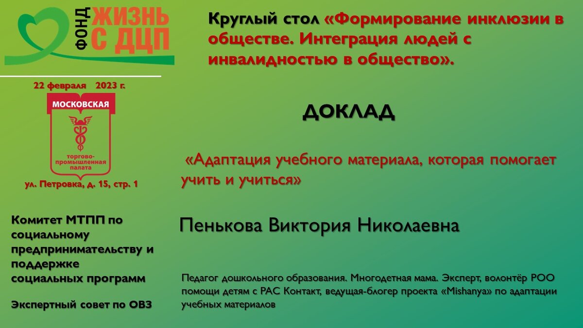 Как вы знаете, детям с ОВЗ очень трудно учиться в общеобразовательной школе наравне с нормо-типичными детьми. К сожалению, как мы уже говорили, школы не готовы к таким ученикам, и не знают, как с ними работать. А ребенок с инвалидностью или ОВЗ часто не может усваивать информацию в том же темпе, что и одноклассники. У многих детей дисграфия или дислексия, им сложно быстро читать и писать, сложно разобраться в материале. Одним из выходов может быть адаптация учебной информации для особенных детей. Как это можно организовать знает Пенькова Виктория Николаевна -педагог дошкольного образования, многодетная мама, эксперт, волонтёр РОО помощи детям с РАС Контакт, ведущая-блогер проекта «Mishanya» по адаптации учебных материалов, которая адаптировала ВЕСЬ учебный материал с 1 по 5 классы общеобразовательной школы. Виктория поделилась своим опытом с нами во время круглого стола «Формирование инклюзии в обществе. Интеграция людей с инвалидностью в общество», организованного Комитетом МТПП по с