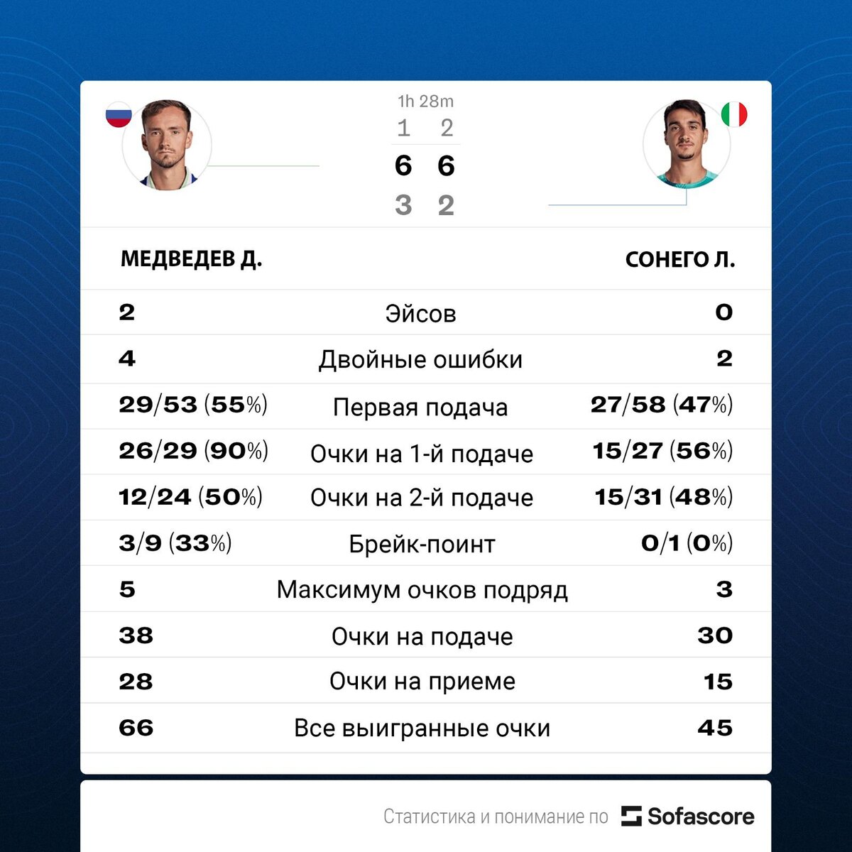 Российский теннисист Даниил Медведев вышел в третий круг турнира ATP серии «Мастерс» в Монте-Карло. 27-летний россиянин, посеянный на турнире под третьим номером, во втором круге обыграл итальянца Лоренцо Сонего, 45-ю ракетку мира, со счетом 6:3, 6:2. Медведев начал выступление на турнире сразу со второго круга. Его следующим соперником станет представитель Германии, экс-вторая ракетка мира Александр Зверев (13-й номер посева). В личных встречах у них счет 7–6 в пользу россиянина. Медведев является пятой ракеткой мира, на его счету 19 титулов ATP в карьере. Россиянин дошел до финала на пяти последних турнирах подряд. Он выиграл титулы в Роттердаме, Дохе, Дубае и «Мастерс» в Майами. На другом американском «Мастерс», в Индиан-Уэллсе, в решающем матче Медведев уступил испанцу Карлосу Алькарасу. Турнир в Монте-Карло завершится 16 апреля. Призовой фонд соревнований составляет €5,7 млн. Серия «Мастерс» уступает по значимости только «Большому шлему» и Итоговому турниру ATP. SofaScore