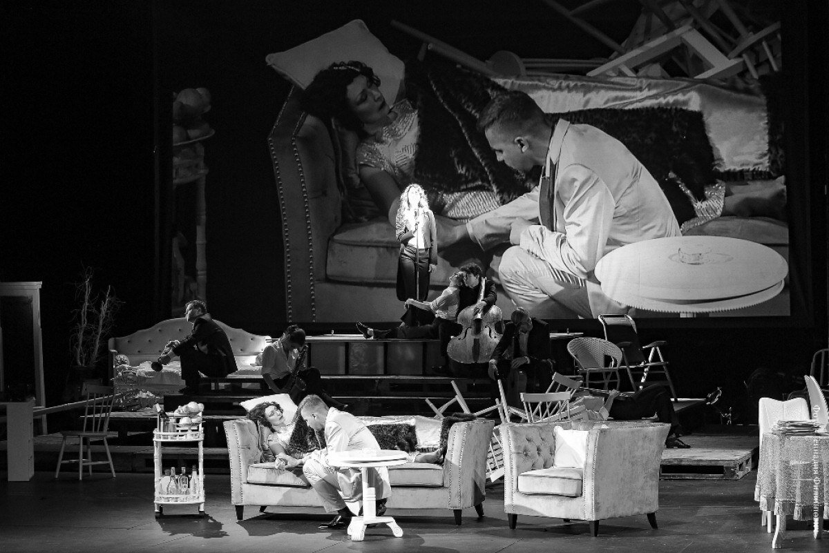 Поймала довольно редкий спектакль репертуарной афиши калининградского драматического – «Бульвар заходящего солнца» по пьесе драматурга Артёма Бруно и сюжету трижды оскароносного фильма. Режиссёр Вячеслав Виттих очень грамотно использовал приём видеотрансляции на сцене, превратив рассказ о закулисье Голливуда и трагедии погасших звёзд в съемки фильма. Это «кино о кино» коварно играет со зрительским восприятием, предлагая возможность альтернативной концовки известной истории – а вдруг забытая звезда немого кино Норма Десмонд вовсе не убила безвестного сценариста Джо Гиллиса, и вся драма – только сценарий разыгрывающегося на наших глазах фильма. Титры, бегущие по заднику-экрану в финале спектакля, добавляют ощущения, что вообще-то зрители находились на съемочной площадке. Но волчка, чтобы проверить реальность, как в фильме Нолана, у нас нет. А значит, нарратив мертвеца, как и в известном фильме, не менее вероятен. Отсылок к кинокартине здесь много, включая чуть модернизированный логотип