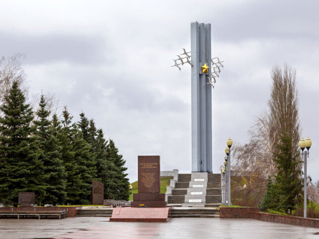 Мемориал «Журавли» Этот красивый памятник виден почти из любой точки города. Открытая в 1982 г. стела достигает 40 м в высоту, ее украшает стая из 12 металлических журавлей, символизирующих погибших солдат. Стела находится в самой высокой части Парка Победы, чтобы до нее дойти, нужно преодолеть несколько десятков ступеней. Вокруг «журавлей» — небольшая, вымощенная мрамором смотровая площадка.