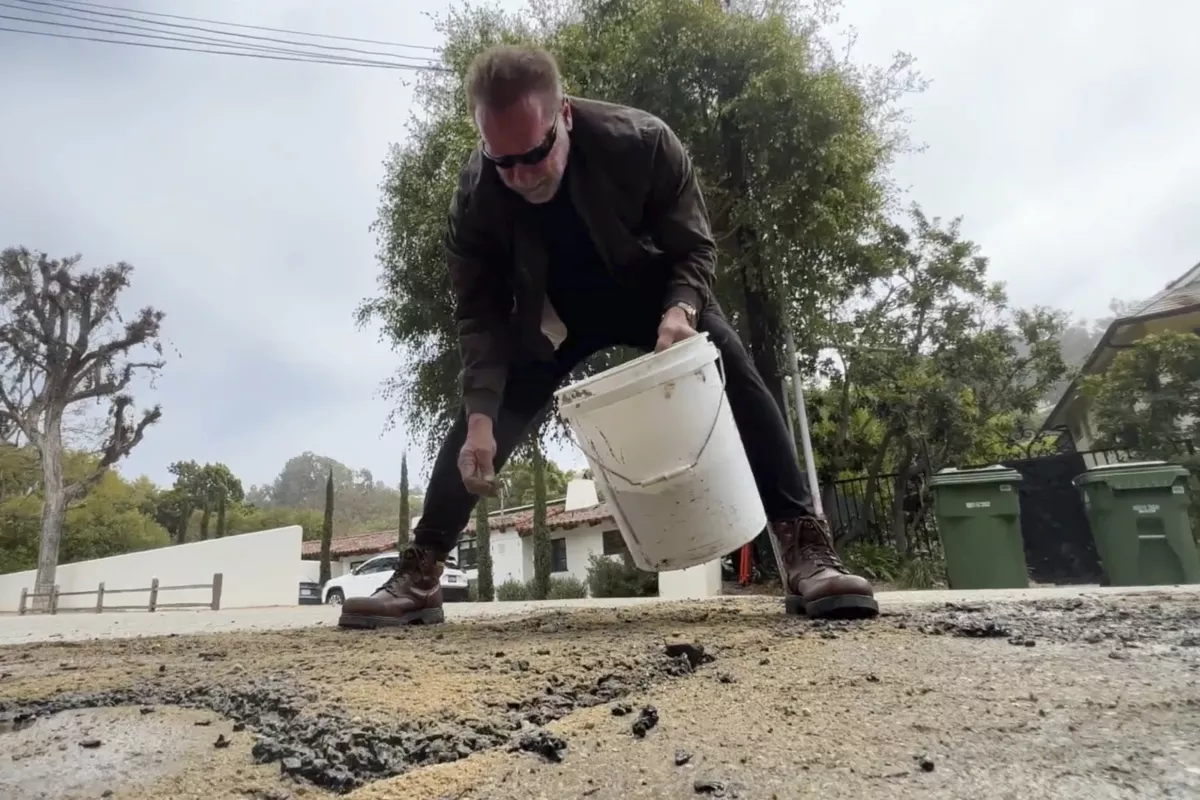 Разбитая дорога заставила самого Шварценеггера взять в руки лопату.