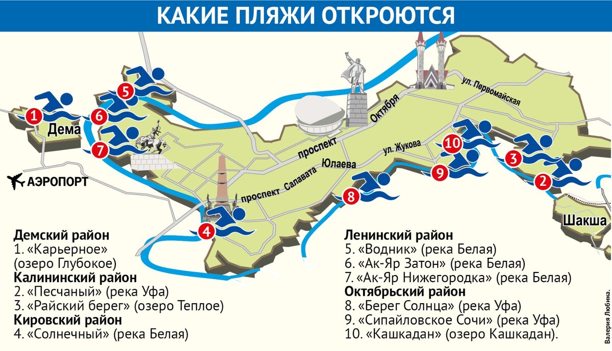 В этом году уфимцы смогут искупаться и позагорать на десяти пляжах. А ведь год назад их было одиннадцать! Как объяснили в городской администрации, пляж «Гольфстрим» на озере Теплом закроют из-за предстоящей реконструкции. Здесь планируют благоустроить береговую зону, провести прогулочные и велодорожки, организовать спортивные и детские площадки. На месте «Гольфстрима», но теперь только в 2024 году, появится новый городской пляж. Традиционно купальный сезон в Уфе открывается в начале июня.