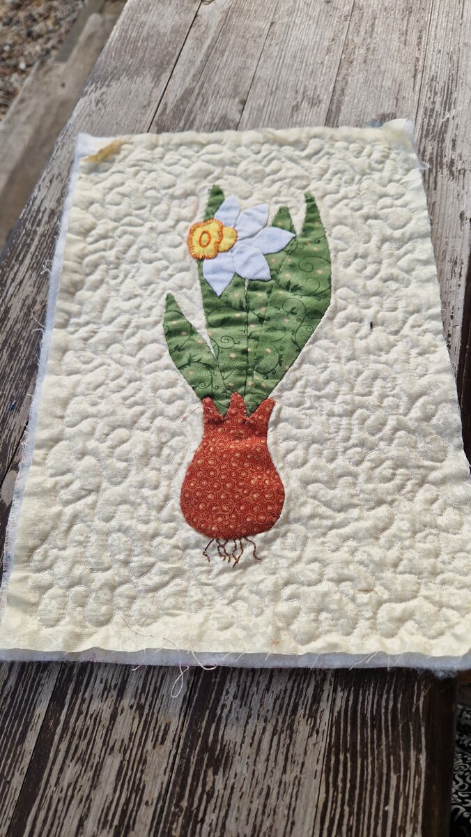 Вчера сделала шаг и... записалась на курс свободно-ходовой стежки. Хватит заниматься самодеятельностью. Подозреваю, что после первых же занятий, я буду как-то иначе смотреть на свои нышешние работы :). Но, пока я ещё нахожусь в неведении, и с упоением ребенка, продолжаю творить свои "шедевры" как умею. Вот цветущая луковка нарцисса. Специально обозначаю что это. Так как есть подозрение, что образ вышел корявенький и не сразу узнаваем :))). Рамочка пока не готова. Но, я и не решила окончательно, что это будет. Самостоятельная вещь, или впишется во что-то, как фрагмент. Это уже законченое микро-панно. Пойдёт в детскую комнату на даче. Решила пока обойтись без стежки. Лучше, все-таки немного подучиться. Когда начнётся курс, не известно. По мне бы - осенью. Летом с дачи уж очень далеко и неудобно ездить. Так что, я -в воодушевлении и в предчувствии чего-то "вкусного".