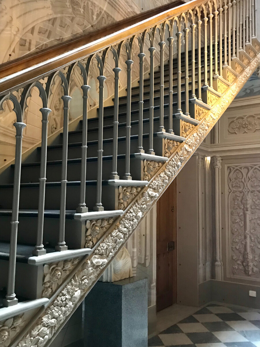 Обойдя первый этаж и налюбовавшись готическим убранством, поднимемся по чугунной лестнице. Сложно поверить, но все пролёты не имеют опор. Из-за этого лестница кажется воздушной.