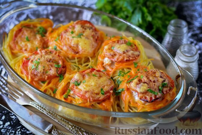 Гнёзда из спагетти с мясным фаршем, помидорами и сыром, запечённые в духовке