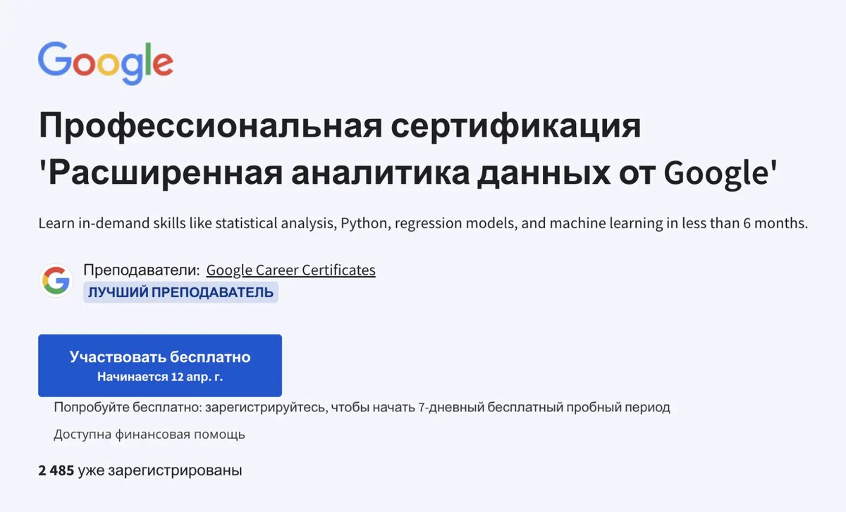 📊 “Расширенная аналитика данных Google”. В этом курсе появляется Python и статистика, машинное обучение для анализа и интерпретации данных.