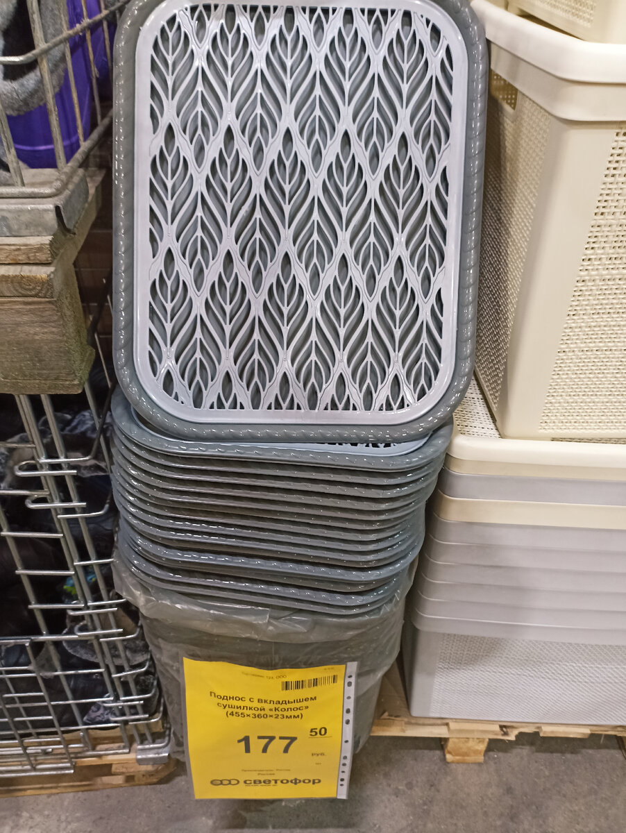 Пластиковый поднос с вкладкой-сушилкой для посуды, размером 45/36 см. Цена 177 рублей.
