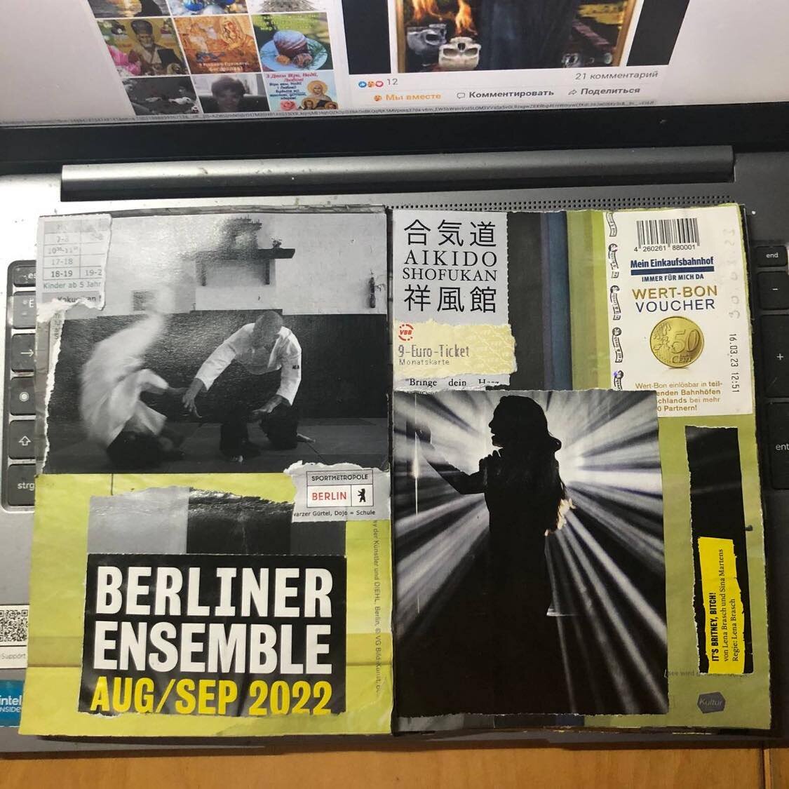 На фото - четвёртый разворот Джанк Арт Бука “Берлинские коллажи”. Коллажи делаю по следам похождений Дениса в Берлине. Видно, что он мечтал заняться айкидо, посещал концерты. Здесь ещё кусочек билета на транспорт за 9 евро. Почему кусочек? Потому что билет не Дениса. Когда в прошлом году беженцы стали прибывать в Берлин, им выдали проездные на все виды транспорта, кроме такси, на месяц, стоимостью 9 евро. А в правом верхнем углу - билет в берлинский туалет, стоимостью 50 центов, хотя на самом деле в автомат бросаешь одно евро. Интресно, куда смотрит немецкая налоговая или у неё с туалетом договорённость? Билетиком в это славное заведение в буке наследила я. Кстати, места общего пользования гораздо приличнее и оборудованее, чем в моём городе, за исключением туалетов в парке Горького, который, к удивлению, не успели переименовать. Есть даже туалет стоимость которого обошлась в три миллиона. Говорят, в нём находятся аквариумы с экзотическими рыбками. Не успела там побывать, но вернусь,