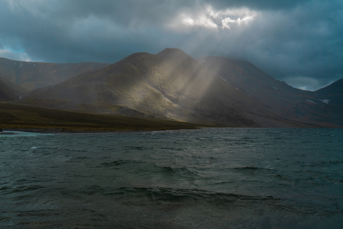 К сожалению, окрестности сильно посмотреть не удалось из-за непогоды, все-таки, мы были там уже во второй половине сентября. Но удивительно другое, мне удалось сделать этот снимок сразу же, как только мы доехали до озера! Просто буквально выскочил из вездехода, подбежал к берегу и сразу же луч солнца осветил гору напротив.
