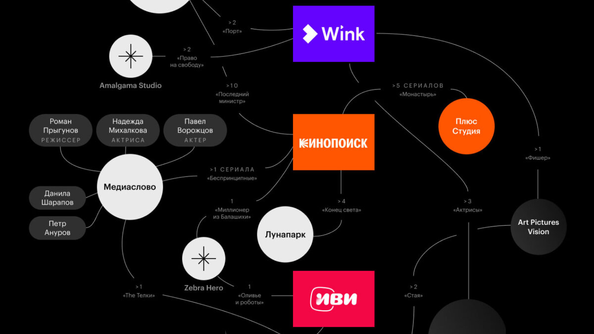 Схема актуальна на конец марта 2023 года. В ней не отражены планы, среди которых прогнозируемое слияния онлайн-кинотеатров (Wink и more.tv готовятся к этому с лета прошлого года) и развитие новых продакшенов — от «Места силы» Валерия Федоровича и Евгения Никишова до Norm Production Вячеслава Дусмухаметова.