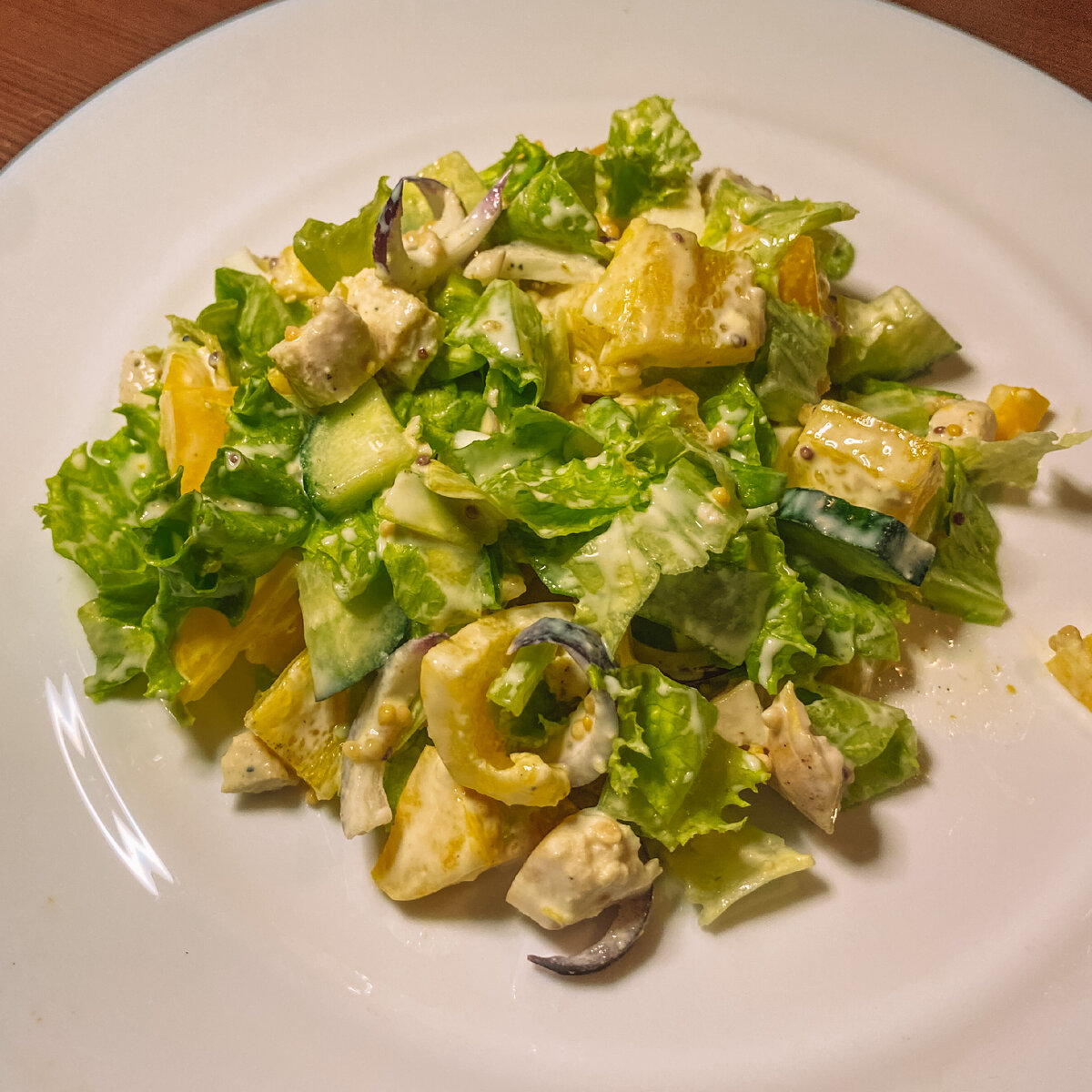 Привет, читатель! Сегодня у нас рецепт простого весеннего салатика, который отлично подойдет на ужин :) Нам понадобится: Для начала нужно отварить яйца и приготовить куриное филе любым удобным для вас способом. Далее все ингредиенты нарезаем, смешиваем, солим и заправляем сметаной. По желанию можно добавить чеснок :) КБЖУ на 100г: Ккал 64.72 Б 7.41 Ж 2.51 У 2.55