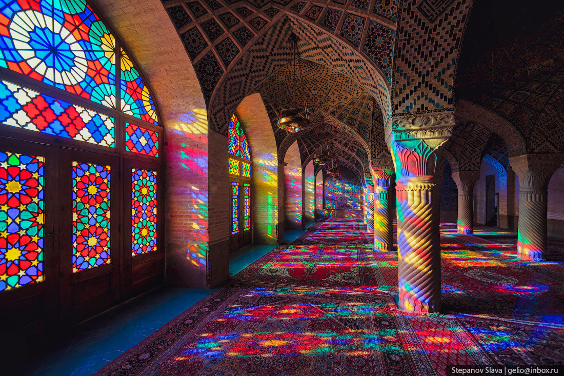 Шираз — это город на юге Ирана, на реке Хошк, неподалёку от озера Мехарлу, примерно в 600 км от Тегерана. Город большой, около 1,5 млн жителей. В Ширазе много достопримечательностей — музеи, древние крепости и мавзолеи. Самые известные и красивые — зеркальные мечети-мавзоли Шах-Черах, Али ибн-Хамзе. А ещё — мечеть-музей Насир оль-Мольк, которую чаще называют Радужной, Розовой и Цветной.