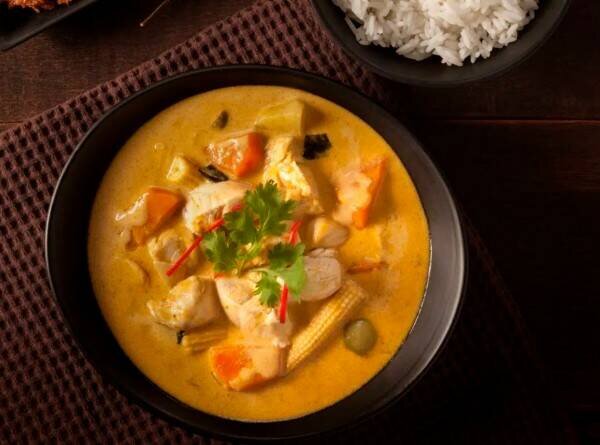 Мусульманское блюдо, Массаман карри родом из индийской кухни и имеет персидское влияние. Он мягкий, сладкий, острый и арахисовый. Как и во многих тайских блюдах, в его основе кокосовый крем, что делает его насыщенным и вкусным. Картофель и курица, тушеные в кокосовом молоке, приправлены множеством трав и специй, включая лавровый лист, корицу, тмин, кинзу, галангал, лемонграсс, мускатный орех… список можно продолжить.