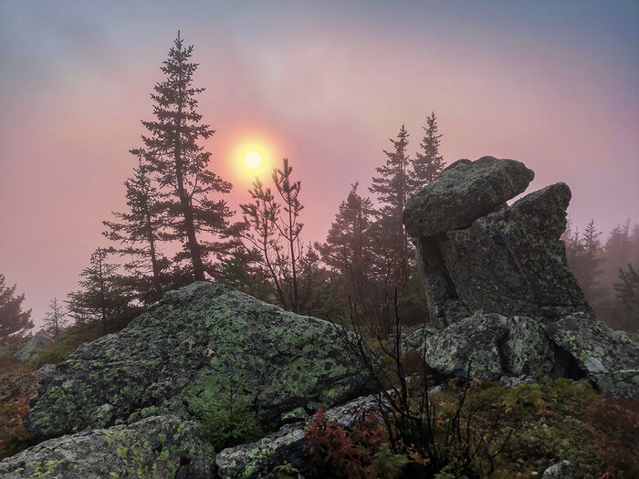 Однажды пригласили меня с женой на вот такой рассвет, дескать, на Урале: Едва глянув на фото краски, мы приняли решение за секунду. И поехали. Стыдно сказать, но мы объехали половину мира, а на Урале так и не были. Нам казалось, что там всё уже затоптано. Однако, оказалось не всё так однозначно. Тропа в парке Таганай - да, оказалась именно такой, как мы и предполагали, грязной и затоптанной. Однако через 10 км стало чуть лучше, а через 20 км и вовсе хорошо. Природа отличается от сибирской. Всё, что казалось нам необычным, мы фотографировали. Хотя иной раз и не понимали, что же мы видим. Например, такой шикарный кустистый лишайник! Потом грибы, знакомые и незнакомые. А это, вероятно, тоже какие-то грибы. Мухоморы нам знакомы, но здесь они огромных размеров. Лес не показался нам интересным, обычный, а вот на грибы мы обратили внимание. Природа вот такая: Некоторые грибы мы решили употребить на ужин: А потом наш проводник нашёл огромный белый гриб! Весом около килограмма! И этот гриб стал